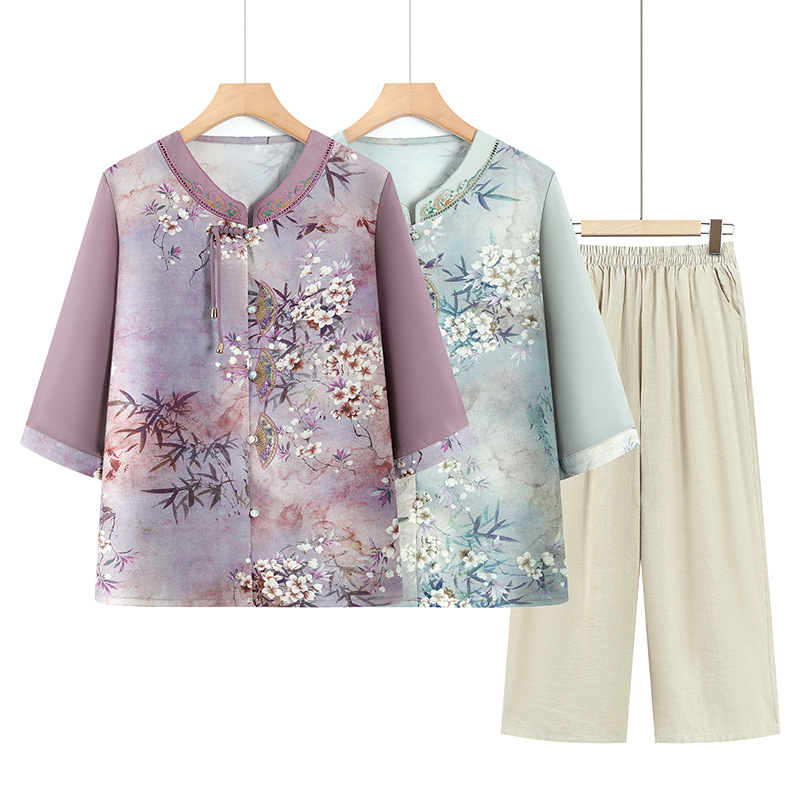 Pakaian Musim Panas Ibu Atasan Gaya Nasional Dua Set T-Shirt Setelan Lengan Pendek Gaya Tiongkok Baru Setengah Baya Elegan Modis Mulia Wanita