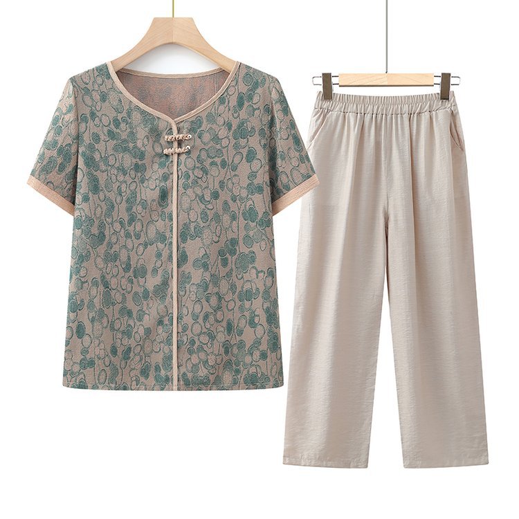 Setelan kaus lengan pendek untuk ibu, pakaian musim panas ibu, kaus lengan pendek gaya Barat, pakaian nenek paruh baya dan lansia, pakaian tipis dua potong untuk orang tua