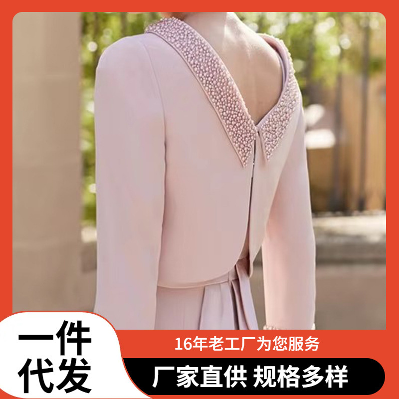 2025 Pakaian Wanita Dua Potong Perdagangan Luar Negeri Gaun Pesta Pernikahan Warna Merah Muda Satin Mutiara Leher Bulat Lengan 3/4 Pakaian Ibu Slim Fit