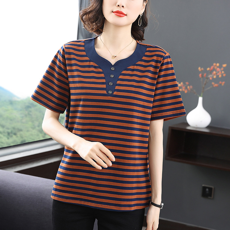 Kaus bergaris ibu paruh baya dan lansia wanita musim panas 2024 lengan pendek gaya Barat pakaian pullover mengurangi usia grosir