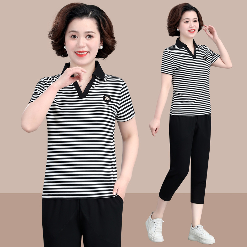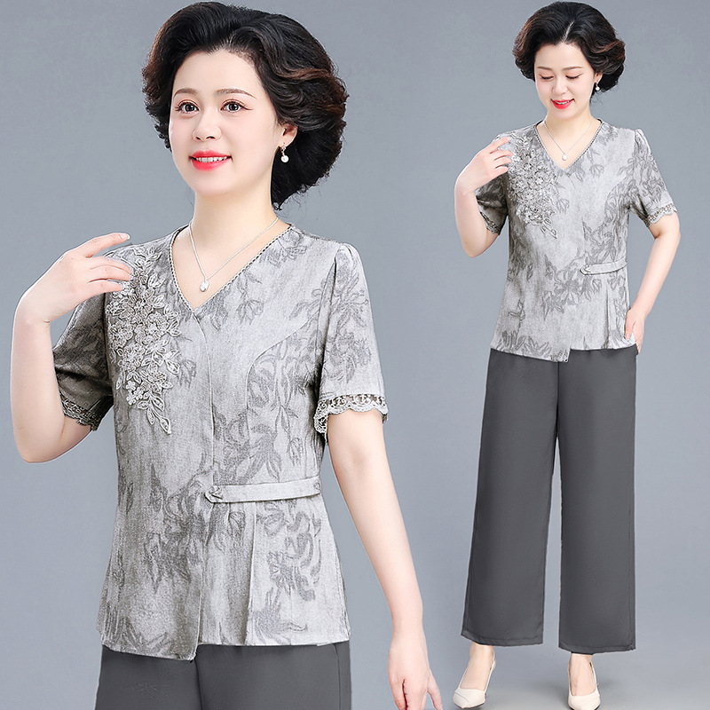 Setelan Modis Musim Panas Ibu Setengah Baya Model Baru Pakaian Wanita Setengah Baya dan Wanita Usia Lanjut Atasan Mengurangi Usia Gaya Barat T-shirt Lengan Pendek Setelan Dua Potong