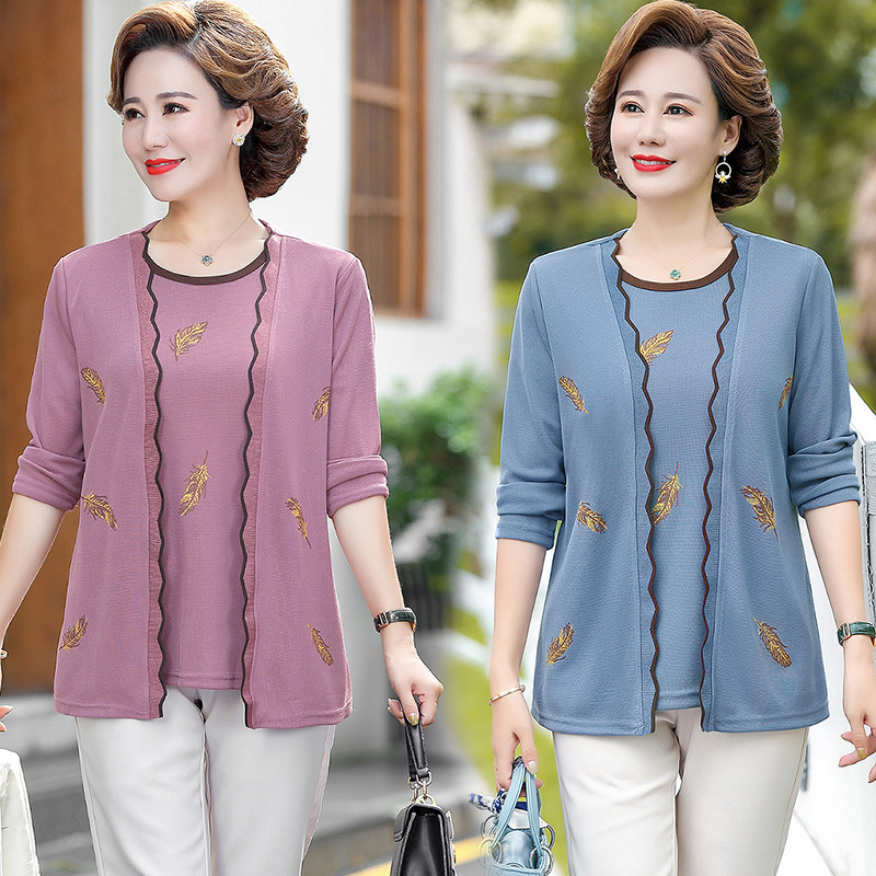 Kaus lengan panjang wanita, pakaian rajut ibu musim gugur 2021 gaya 40 tahun usia sedang dan orang tua musim semi set dua potong