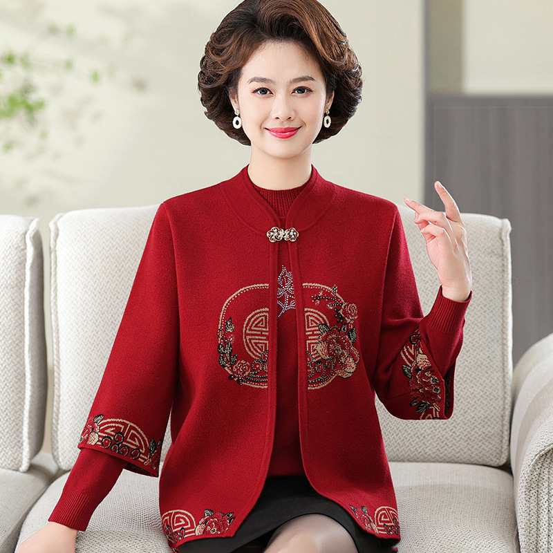 Mantel merah pernikahan musim gugur ibu bahagia kardigan rajut ibu mertua bahagia pakaian banquet Pernikahan musim gugur dan musim dingin wanita paruh baya dan lansia