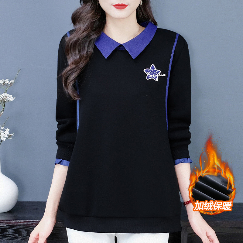 Kemeja polo atasan untuk wanita usia 40 tahun, kemeja dasar warna kontras hangat lengan panjang lapel longgar tebal fleece-lined musim gugur dan musim dingin