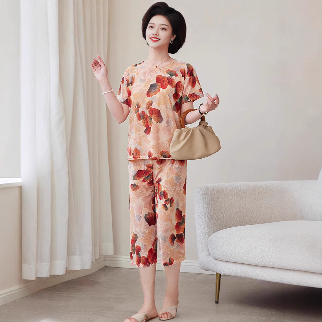 Pakaian Ibu Setengah Baya Musim Panas Celana Tujuh Perempat Lengan Pendek Model Tipis Sutra Es Setelan Dua Set Longgar Nenek Terlihat Kurus Menutupi Perut