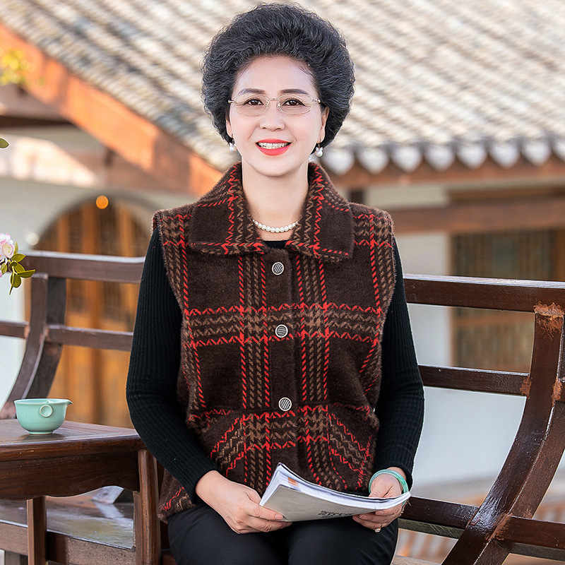 Ibu rompi kardigan kotak-kotak, cerpelai palsu kancing kotak-kotak gaya baru musim gugur untuk wanita paruh baya dan lansia, rompi rajut longgar modis