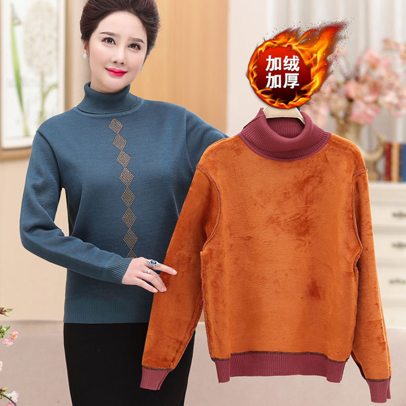 Pakaian musim gugur dan musim dingin ibu sweter berlapis bulu wanita paruh baya dan orang tua kaos Dalaman leher kura-kura tebal atasan hangat longgar nenek