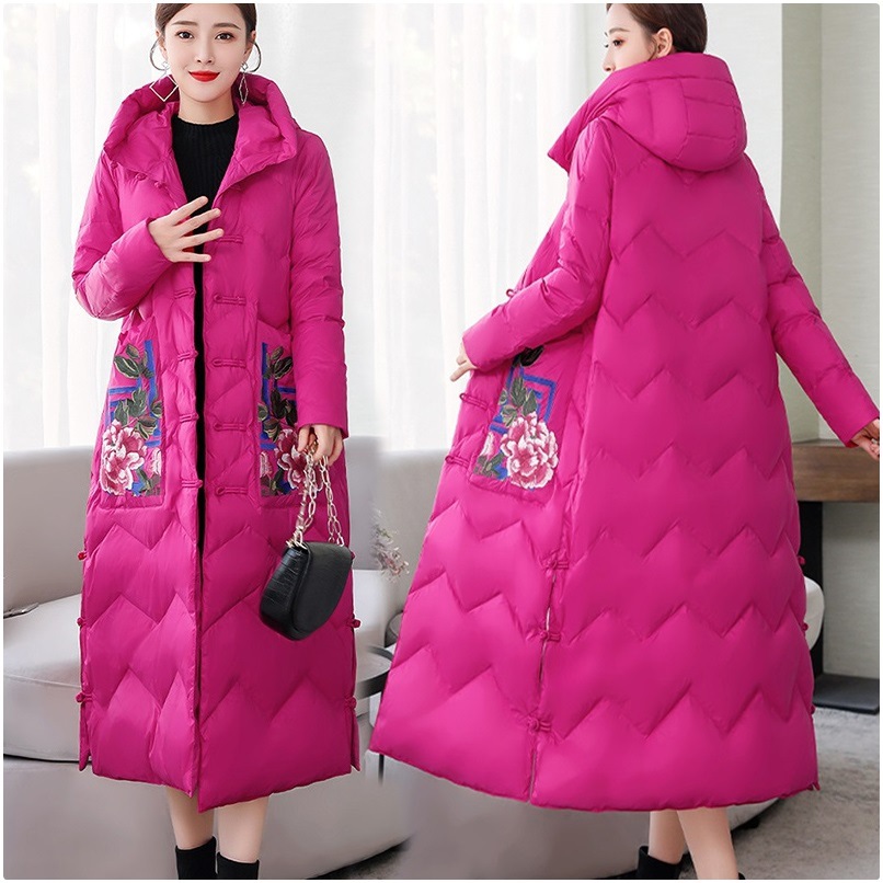 K2 jaket down ibu wanita, setengah panjang atas lutut gesper longgar bersulam gaya etnik artistik retro musim dingin bebek putih