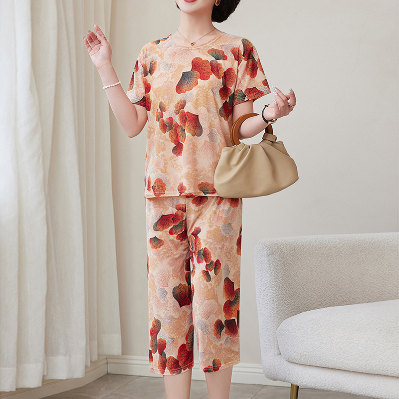 Setelan Ibu Paruh Baya Musim Panas Pakaian Rumah Tangga Wanita Sutra Es Setelan Dua Potong Lengan Pendek Santai Longgar Tambah Besar