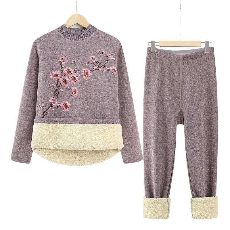 Pakaian musim gugur paruh baya dan lansia, pakaian wanita paruh baya musim gugur musim dingin, setelan atasan celana dan ibu hangat dua potong