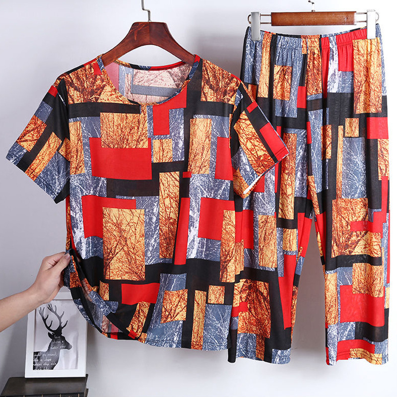 Setelan Wanita Musim Panas Sutra Es Pakaian Tua Ibu Kaus Lengan Pendek Nenek Celana Tiga Perempat Set Dua Potong Wanita Tua Modis