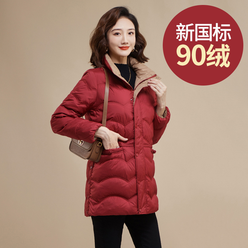 Jaket bulu angsa untuk wanita, jaket gelombang setengah panjang, jaket musim dingin baru 90 beludru merah usia sedang dan orang tua