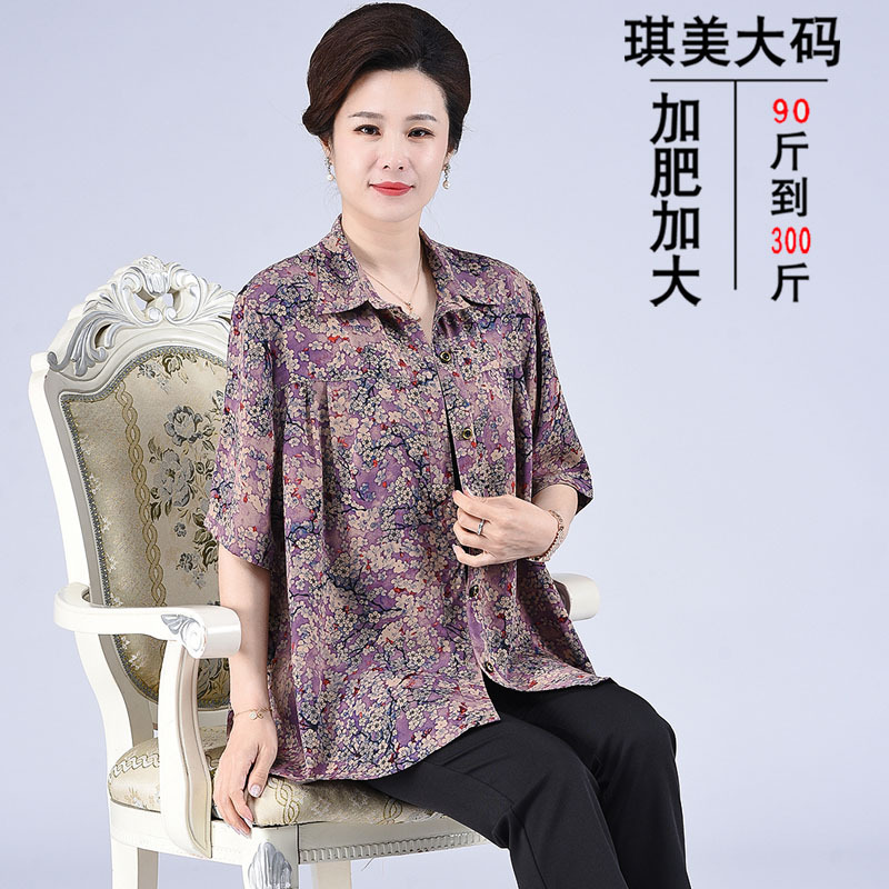 Kemeja wanita paruh baya dan lansia, pakaian atasan kardigan ibu ukuran besar lengan pendek musim panas 200kg