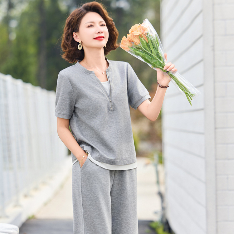 Pakaian Musim Panas Ibu Setelan Olahraga Setengah Baya dan Tua Model Baru Atasan Dua Potong Palsu Kasual Celana Lurus Modis Mengurangi Usia Setelan Dua Potong