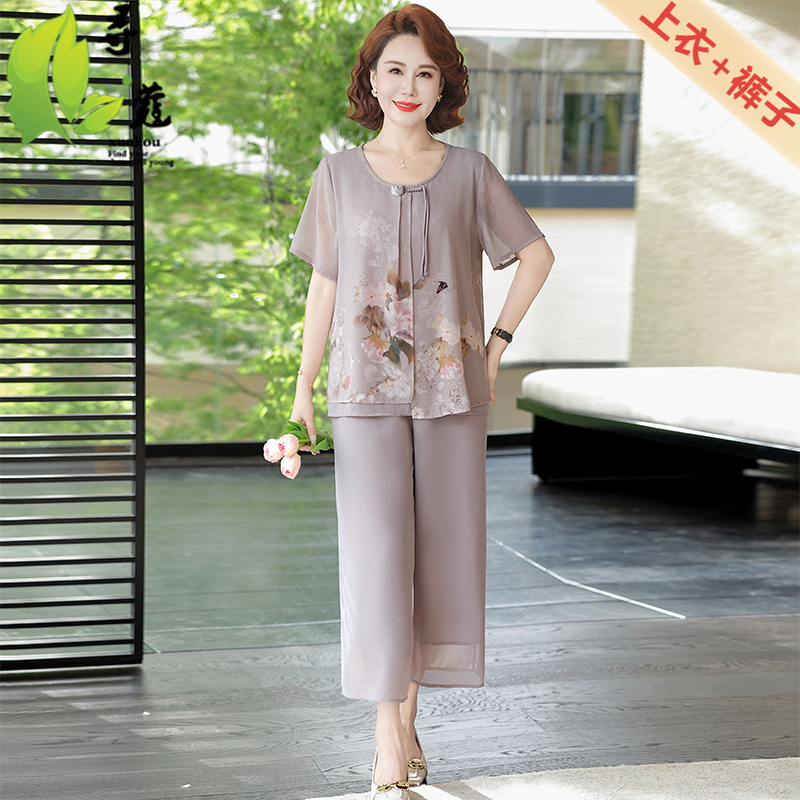 Pakaian Ibu Setengah Baya Ukuran Besar Pakaian Musim Panas Modis Pakaian Wanita Paruh Baya Pakaian Musim Panas Pakaian Sifon Lengan Pendek Set Dua Potong Setelan Wanita