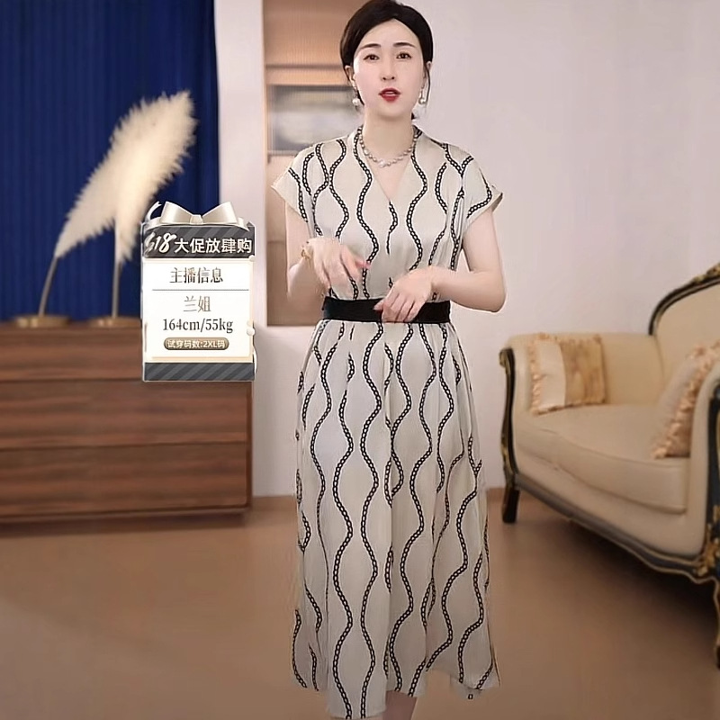 Gaun Mama Rok Panjang Sedang Kerah V Musim Panas Rok Lengan Pendek Elegan Barat Pakaian Wanita Setengah Baya dan Tua Model Baru 2025