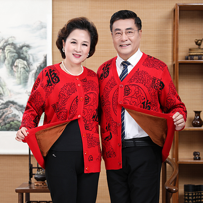 Sweater kasmir merah besar untuk pria wanita, pakaian ibu sweater kasmir usia sedang dan lansia, mantel karakter fu, sweater tebal Tahun Lahir