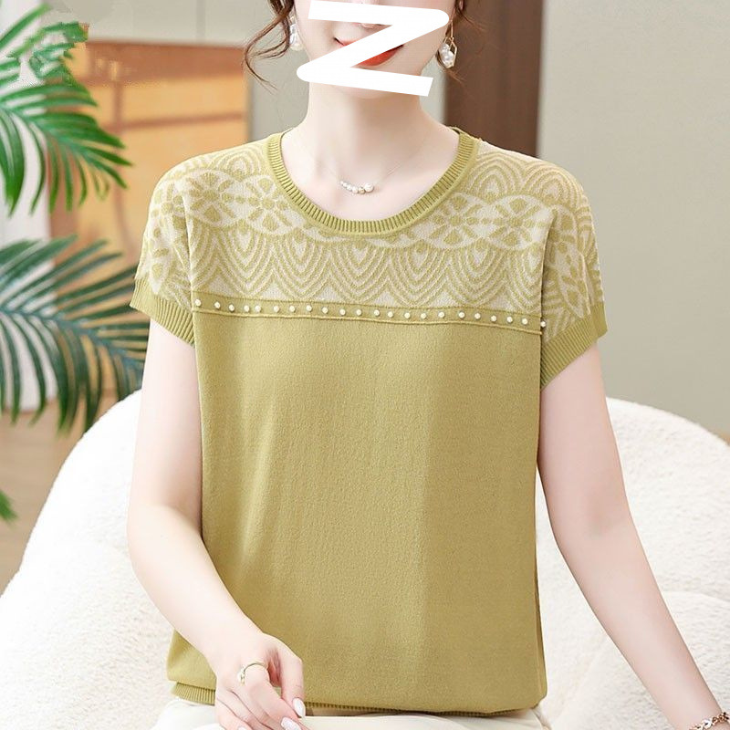 Atasan Rajutan Musim Panas Model Baru Musim Panas Model Baru Lengan Pendek Sutra Es Model Tipis Gaya Barat Ibu Setengah Baya