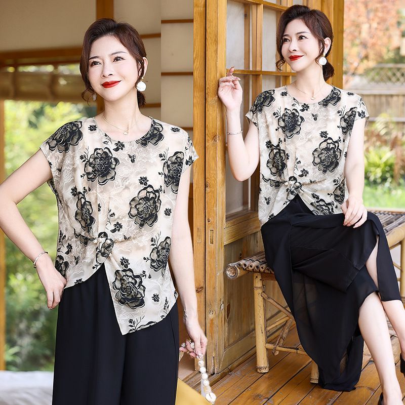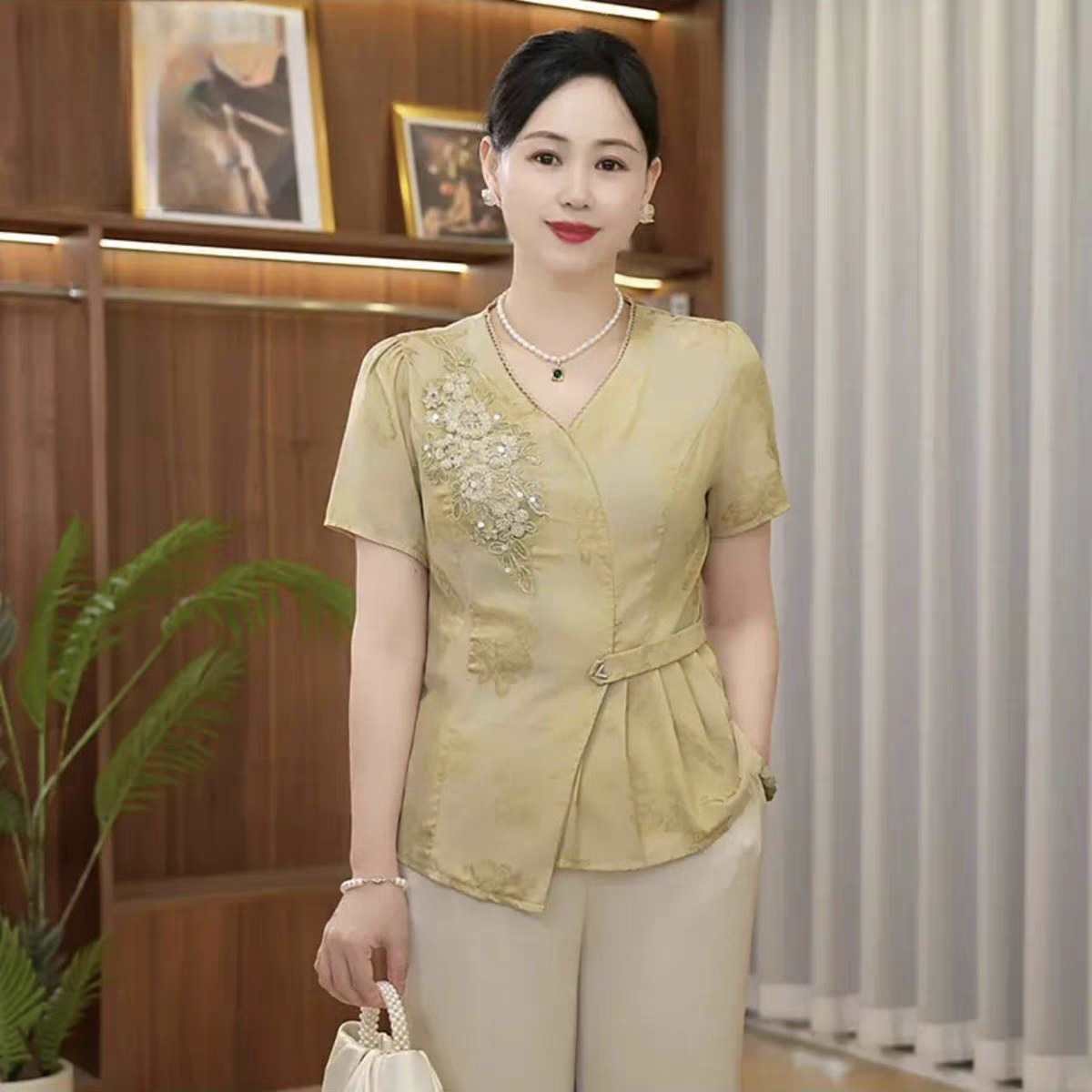Setelan Musim Panas Ibu Modis Model Baru Atasan Elegan Gaya Tiongkok Kemeja Kecil Gaya Nasional Lengan Pendek Wanita Setengah Baya Setelan Dua Potong