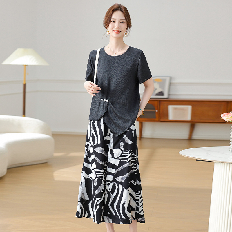 Set Lengan Pendek Setengah Baya dan Tua Bernapas Ibu Modis Model Baru 2025 Atasan Musim Panas Celana Rok Gaya Barat Setelan Dua Potong Mengurangi Usia