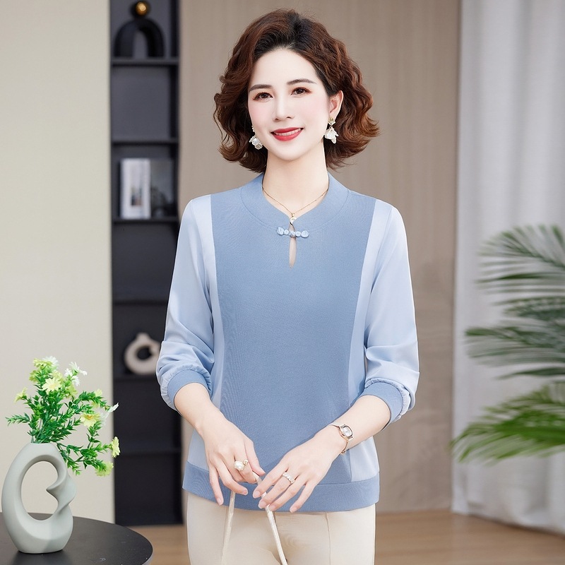 Suara bambu atasan ibu Musim Semi Baru 2024 kemeja kecil wanita usia sedang lengan panjang pakaian komuter OL