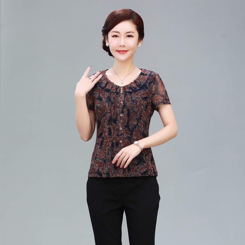Setelan Pakaian Musim Panas Elegan Ibu Muda Kemeja Sifon T-shirt Lengan Pendek Wanita Setengah Baya Atasan Pinggang Wanita Mulia