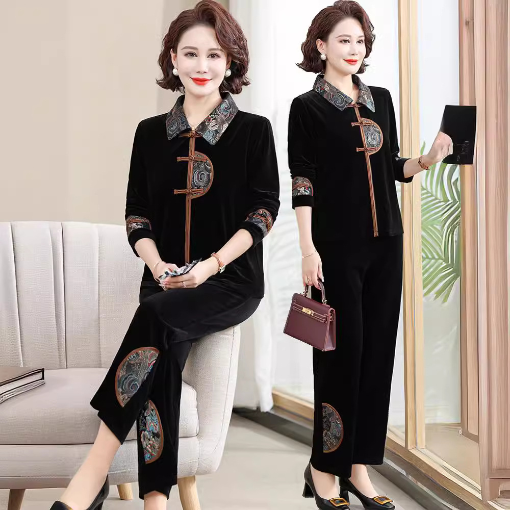 Pakaian wanita paruh baya dan lansia, pakaian musim semi dan musim gugur atasan beludru emas, pakaian musim semi ibu usia sedang gaya etnik dua potong baru 2024