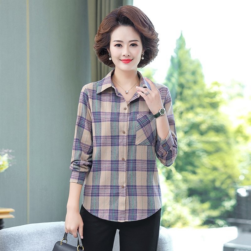 Kemeja wanita paruh baya dan lansia, kemeja musim semi katun lengan panjang kotak-kotak 50 tahun baju atasan wanita paruh baya dan ibu
