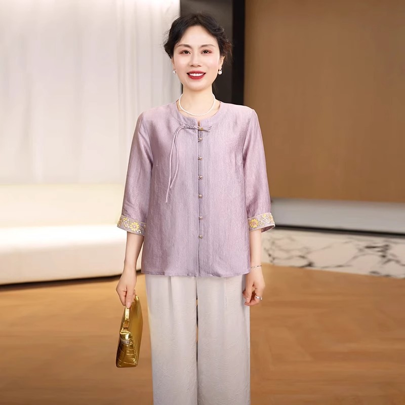 Setelan Dua Potong Retro Pakaian Ibu Gaya Tiongkok Baru Kemeja Lengan 3/4 Wanita Paruh Baya Model Baru Musim Semi dan Musim Panas