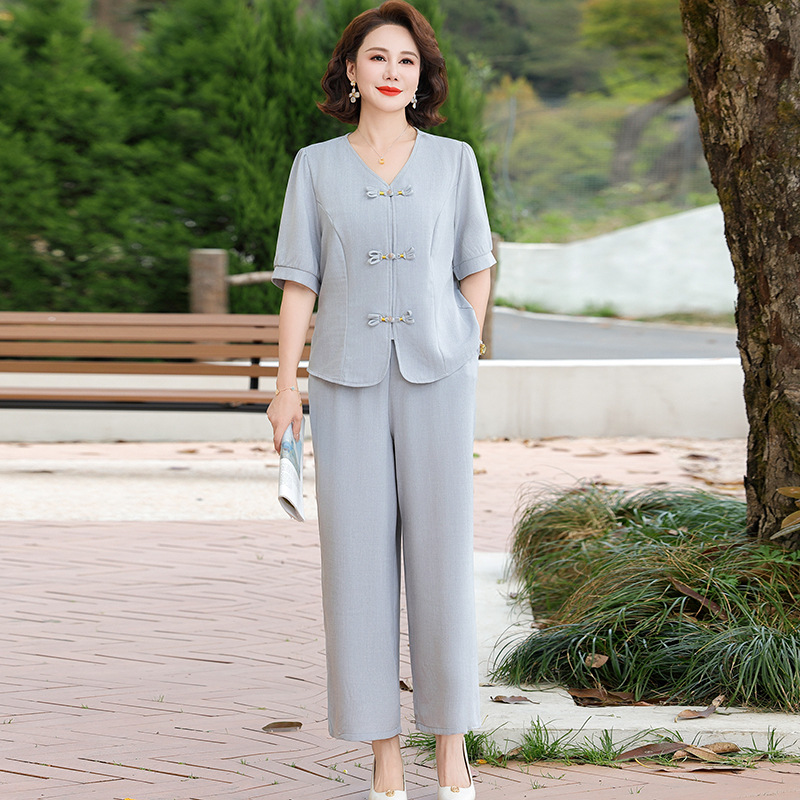 Setelan Musim Panas Ibu Gaya Tiongkok Baru Pakaian Wanita Paruh Baya dan Tua Kerah V Elegan Model Baru Musim Panas 2025 Setelan Dua Potong Gaya Barat
