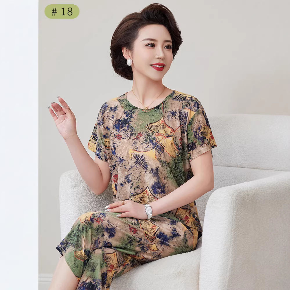 Pakaian Ibu Sutra Es Menutupi Perut Terlihat Langsing Celana Tujuh Perempat Lengan Pendek Nenek Musim Panas Set Dua Potong Longgar Model Tipis Setengah Baya dan Lansia