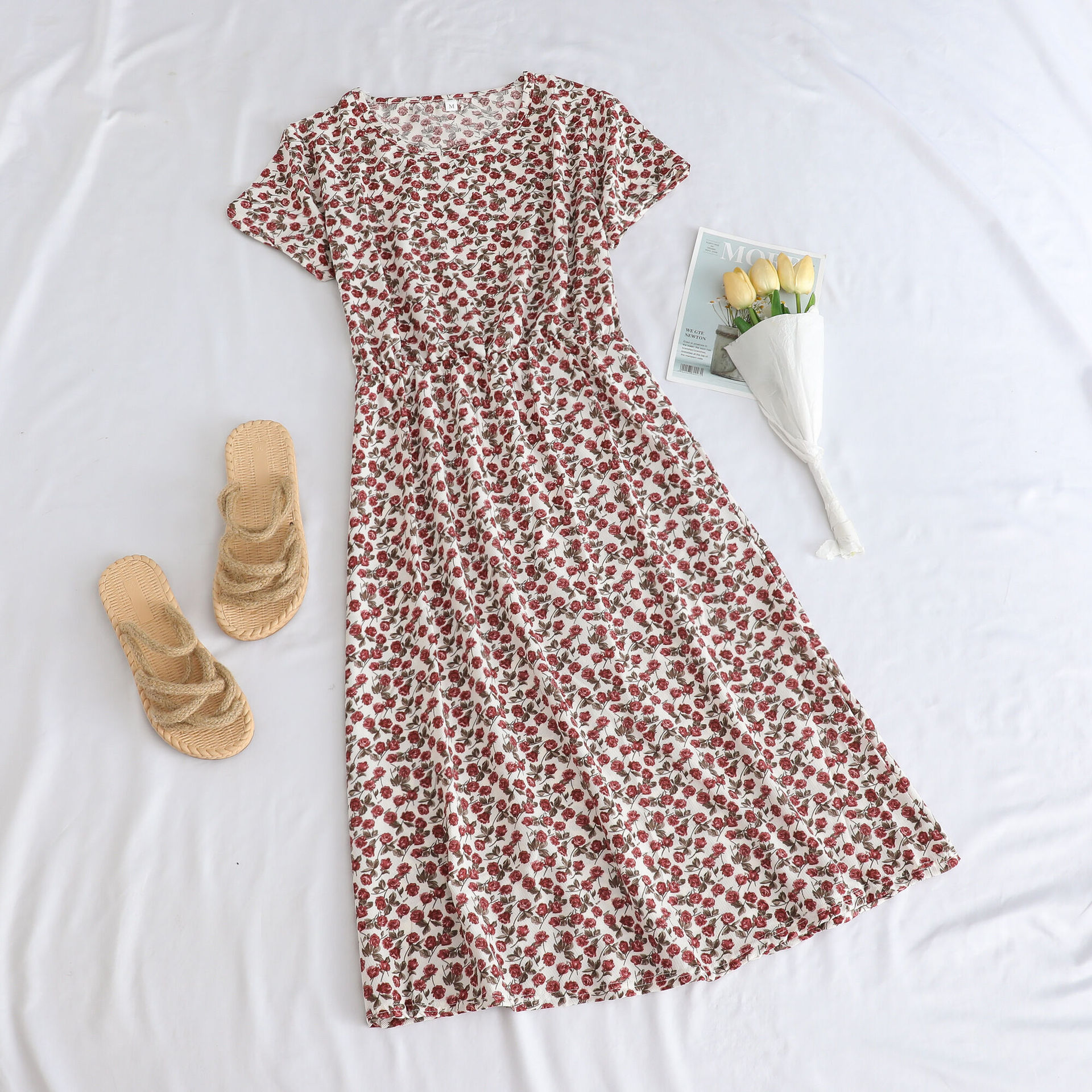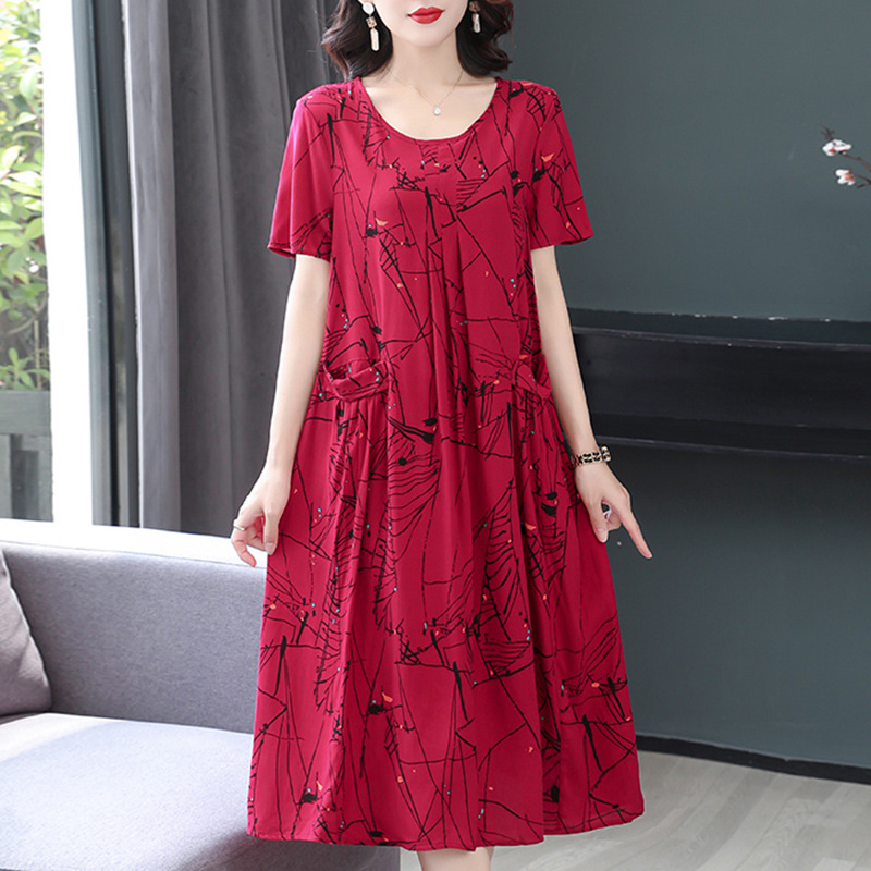 Gaun katun buatan lengan pendek untuk wanita, Gaun wanita usia sedang ukuran besar, gaun katun selutut lengan pendek musim panas 2024