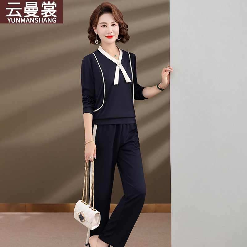 Setelan pakaian wanita setengah baya dan lansia, pakaian musim gugur wanita modis baru kerah V pullover lengan panjang temperamen mengambang timbal dua potong