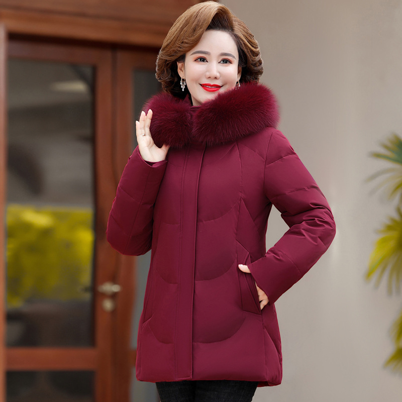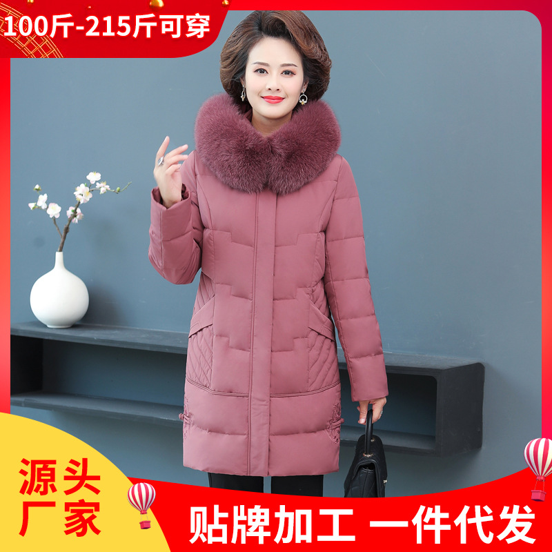 Pakaian Ibu Kerah Bulu Besar Jaket Musim Dingin Dipertebal Setengah Baya Bulu Bebek Putih Setengah Baya Pakaian Ibu Model Panjang Sedang