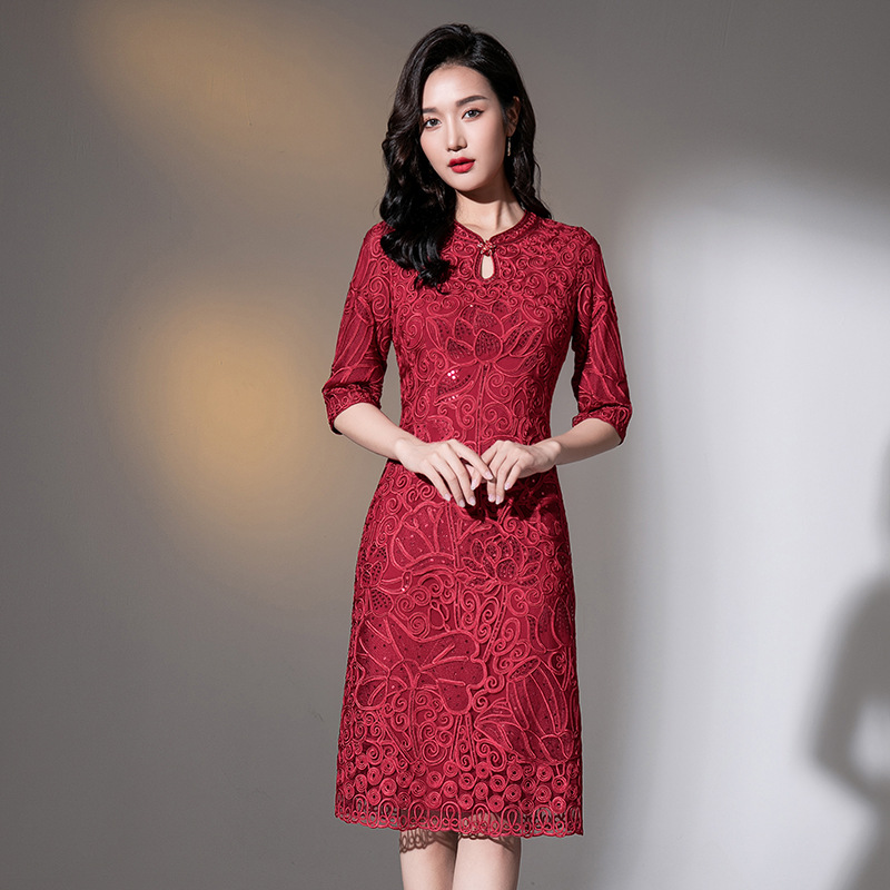 Gaun cheongsam roti bakar Cina, gaun ibu perjamuan pernikahan, gaun merah anggur elegan [8862]