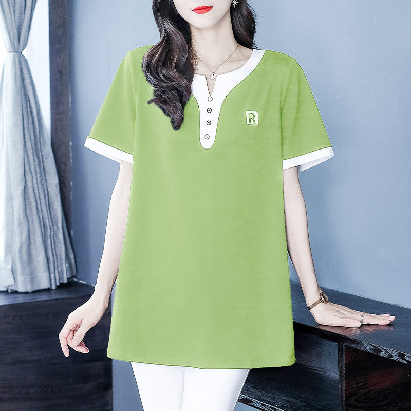 Kaus katun lengan pendek ibu paruh baya, Kaus katun musim panas modis ukuran plus menutupi perut longgar lengan setengah panjang