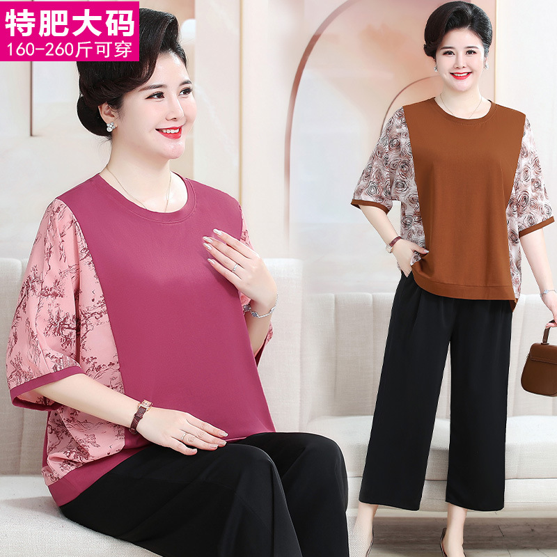 Setelan kasual wanita paruh baya dan lansia, setelan dua potong longgar lengan pendek, musim panas nenek gemuk, gaya Barat, setelan kasual untuk wanita paruh baya dan lansia