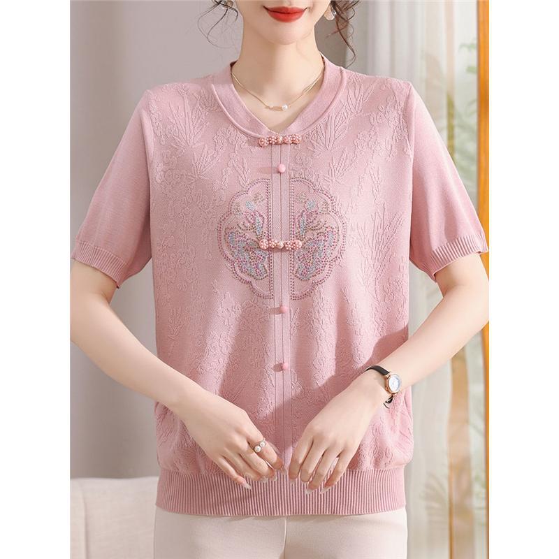 Pakaian Musim Panas Ibu Kemeja Kecil Sutra Es Lengan Pendek Gaya Tiongkok Baru Set T-shirt Model Tipis Musim Panas Wanita Setengah Baya dan Setengah Baya Pakaian Atasan Elegan