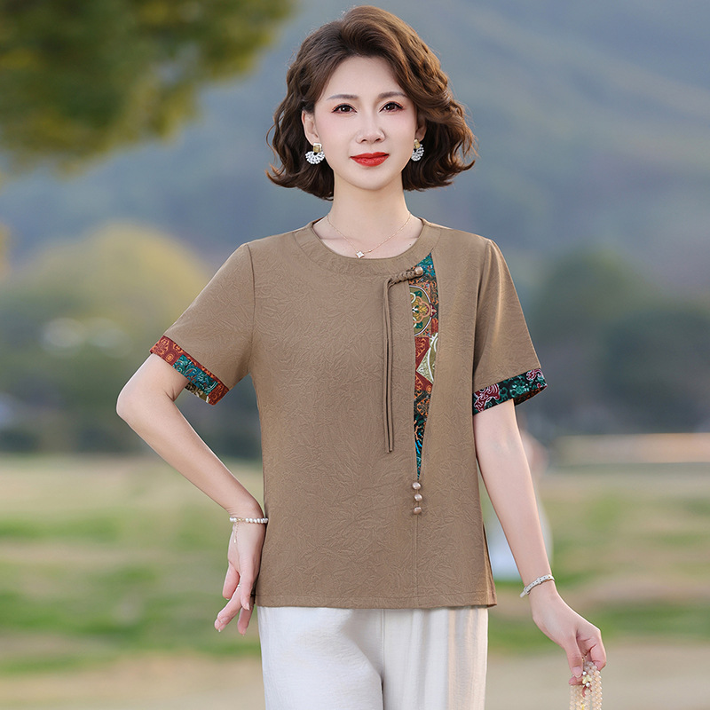 Pakaian Ibu Hari Ibu Musim Panas Pakaian Wanita Atasan Setengah Baya dan Tua Gaya Tiongkok Baru Longgar T-shirt Nenek Lengan Pendek Setelan Netral