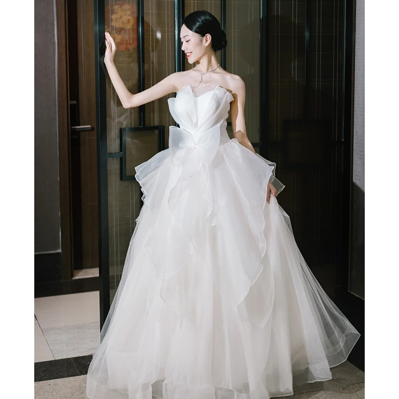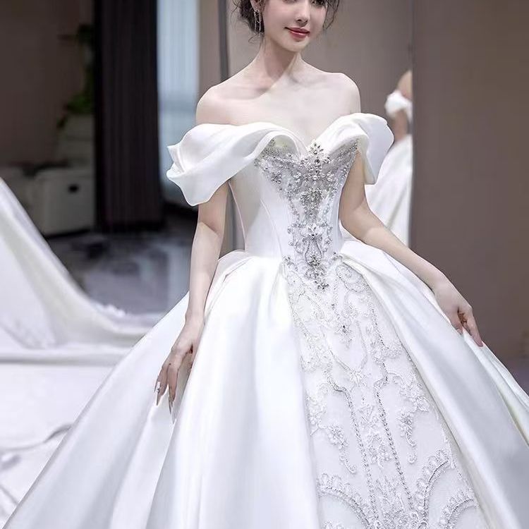 Gaun pernikahan Suzhou 2024 baru ekor pengantin kecil bahu terbuka benang utama sederhana Prancis temperamen Mori impian