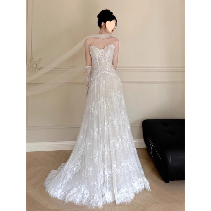 Gaun Pengantin Ringan Gaya Perancis Pengantin Wanita Gaun Penyambutan Tamu Ekor Kecil Ekor Ekor Peri Gaya Mori
