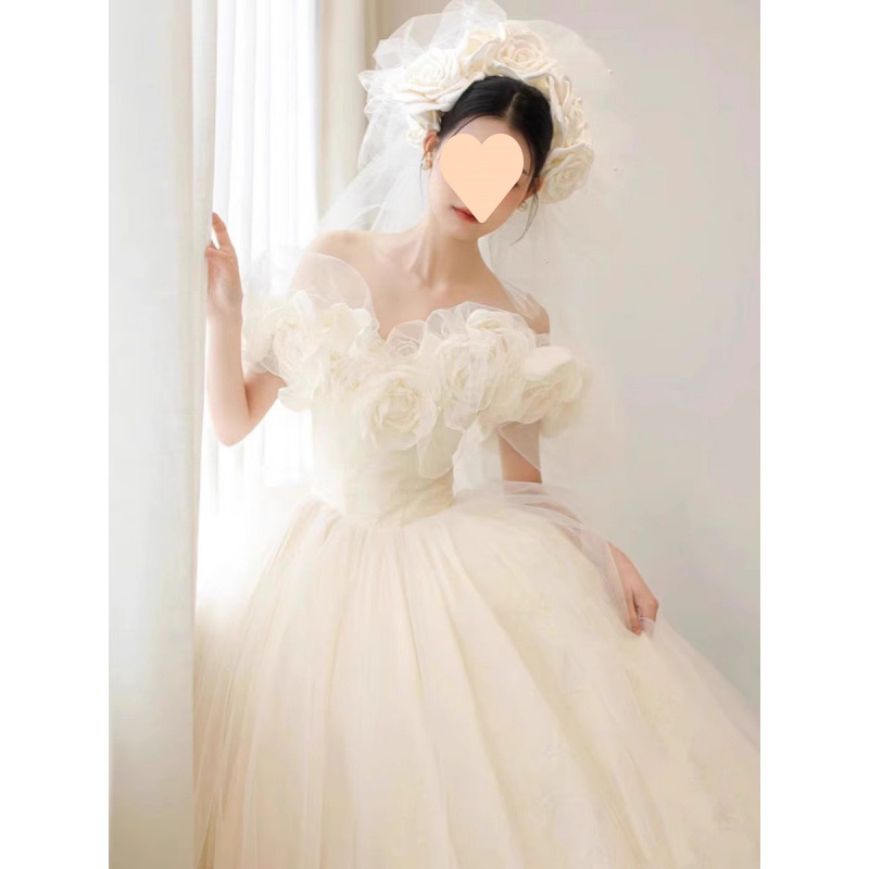 Gaun Pengantin Warna Putih Bahu Tunggal Wanita Rambut Lurus Benang Utama Retro Prancis Model Berat Model Baru 2025