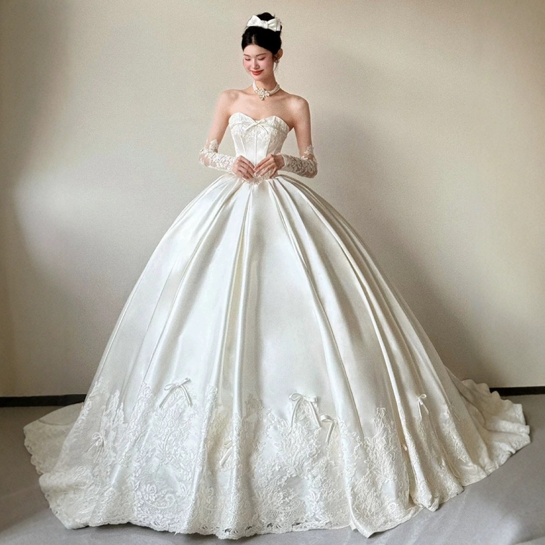 Gaun Utama Gaun Pengantin Satin Model Baru 2025 Lengan Panjang Pengantin Wanita Gaya Perancis Heavy Industry Mewah Gaya Istana Benang Ekor Besar