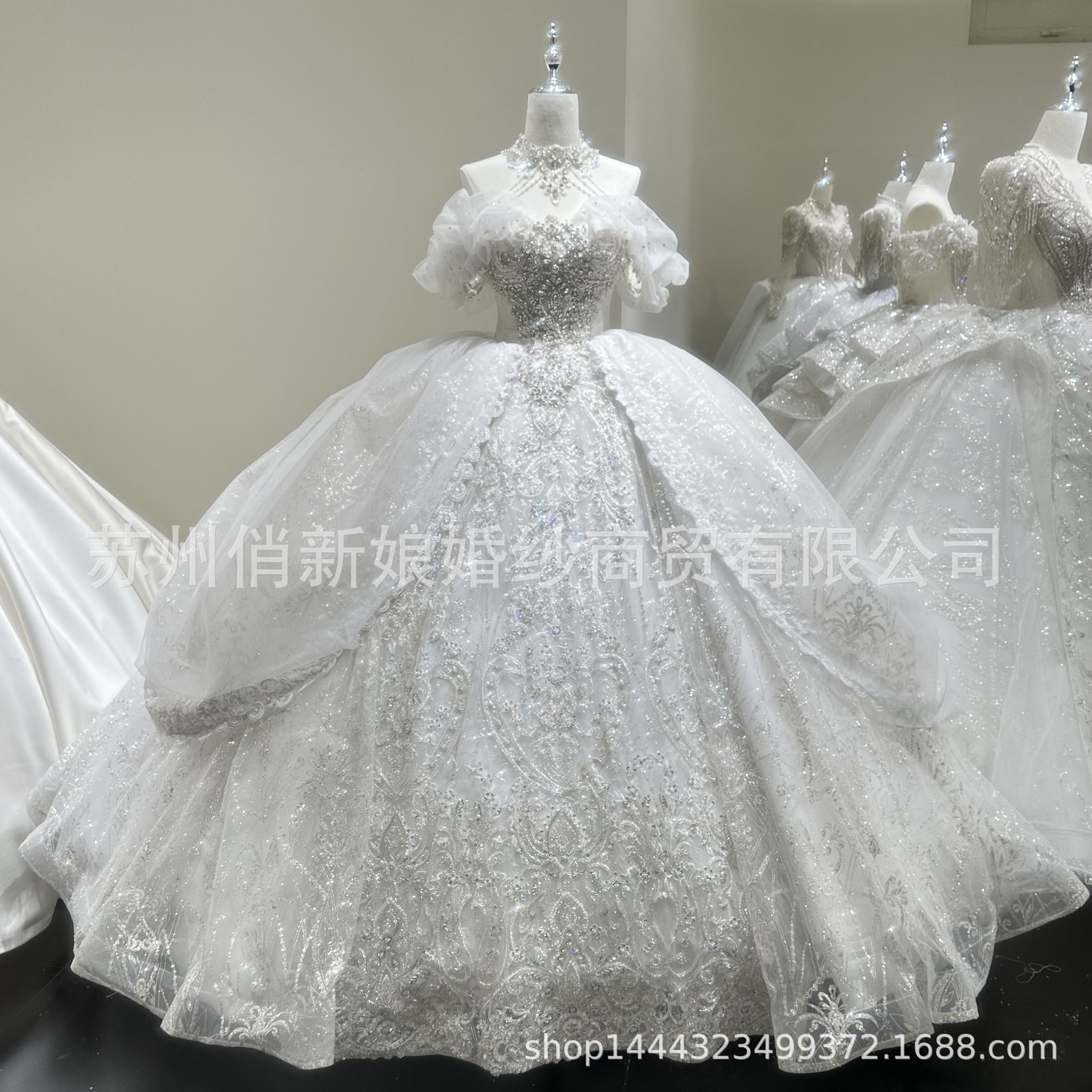 Gaun Pengantin Prancis Model Baru 2025 Pengantin Wanita Berkualitas Tinggi Tekstur Berat Mewah Berekor Gaya Istana Benang Utama Menutupi Lengan