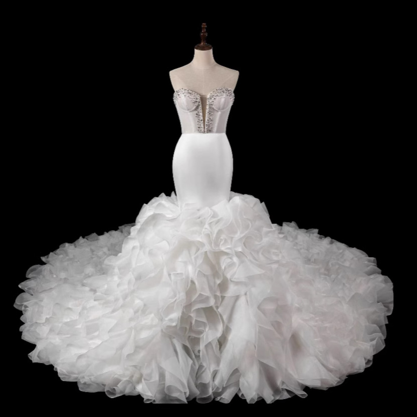 Gaun Pengantin Wanita Rok Panjang Ekor Ikan Industri Berat Bahan Satin Bala Satin Bala Ikan Manik-manik Kerah V Ekor Besar untuk Perjamuan Pernikahan