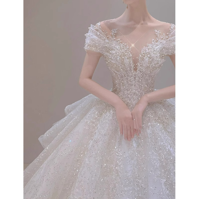 Gaun Pengantin Utama Lengan Pendek Ringan Gaun Pengantin Model Baru Pengantin Wanita Utama Pria Kecil Prancis Ekor Besar Wanita Hamil Keluar Musim Panas