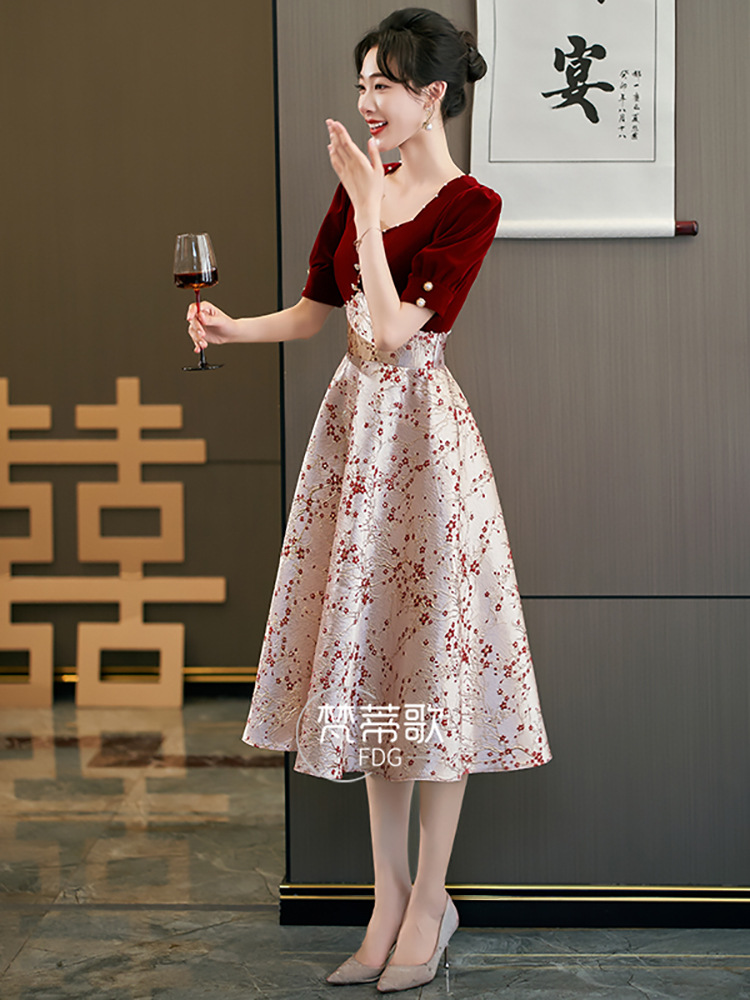 Gaun pengantin bersulang 2023 musim panas baru kerah persegi rok panjang anggur merah pertunangan biasanya bisa memakai gaun