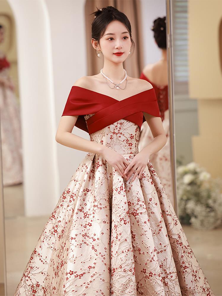 Gaun pengantin bersulang, Gaun malam perjamuan merah pelangsing kerah berdiri Musim Panas 2024, Gaun panjang pernikahan Tiongkok