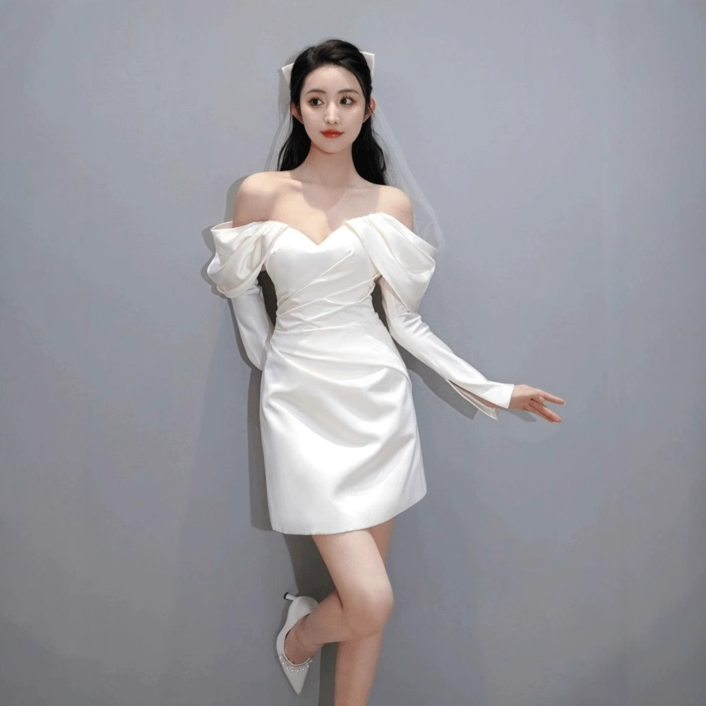 Gaun Pengantin Bahu Ringan Gaya Perancis Pakaian Bersulang Lengan Panjang Model Pendek Pertunangan Pengantin Wanita Rok Putih Kelas Atas Elegan Elegan