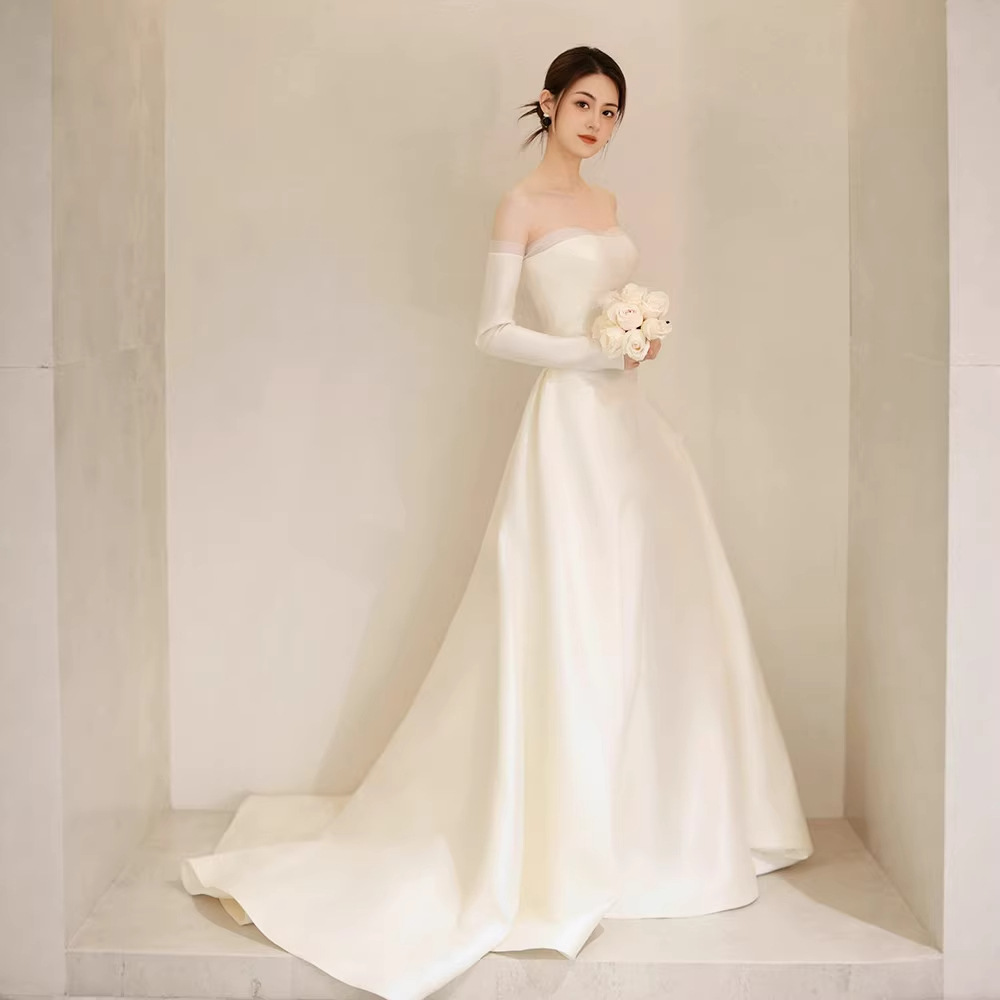 Gaun pernikahan Satin, gaun bahu terbuka lengan panjang fotografi perjalanan luar ruangan warna putih sederhana 2024